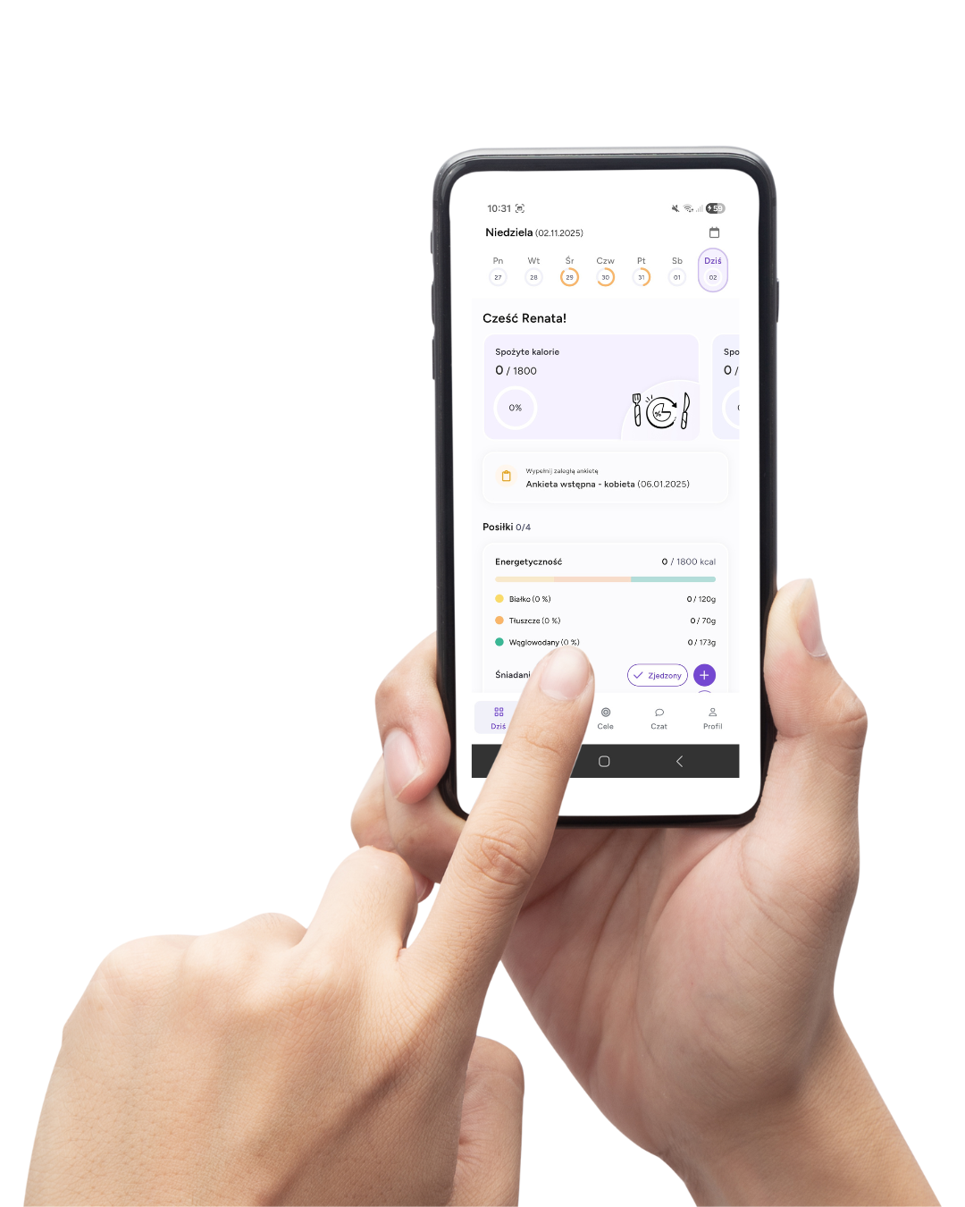 Aplikacja przypomina o posiłkach, ułatwia kontrolę nawodnienia i pozwala analizować Twoje wyniki.